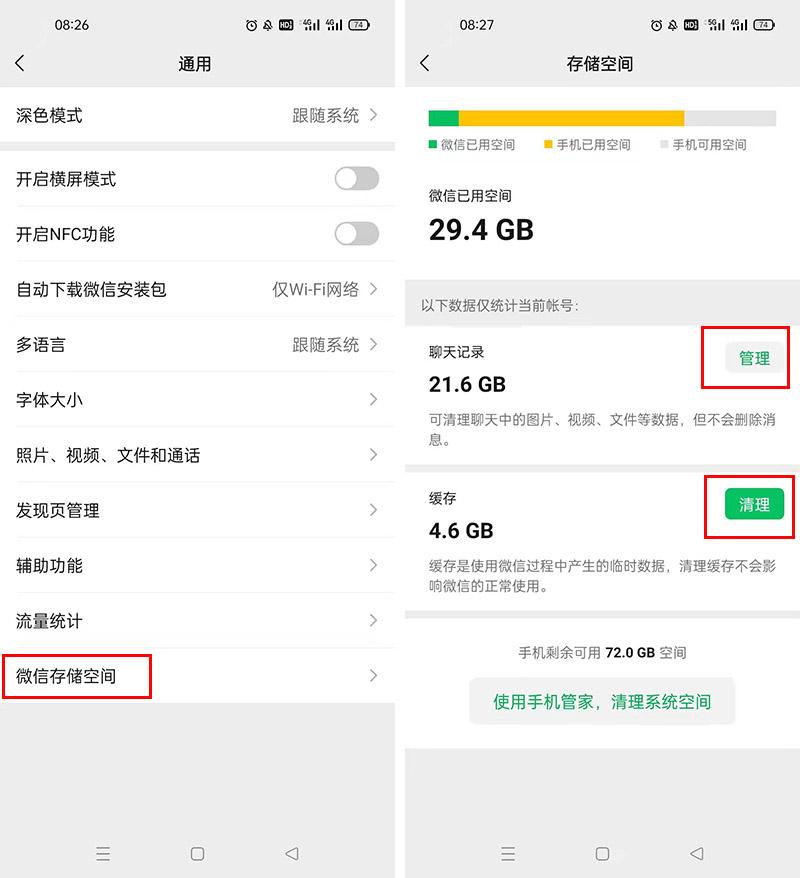 当然,关于微信的专门清理,大家也可以在微信里进行,打开微信,点右下角的【我】-【设置】-【通用】-【存储空间】进行清理,分类和手机管家界面的有所区别,可以专门清理不重要的人及不重要的群的消息。