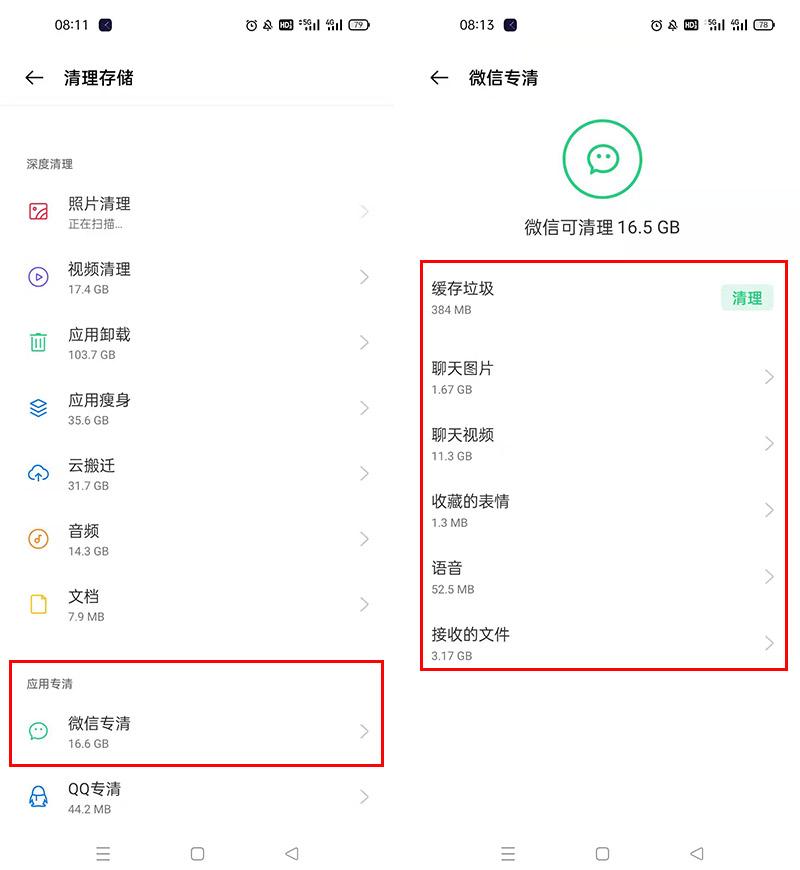 告诉大家一个方法可以通过手机管家释放大量内存,那就是在【清理存储】下拉到最后,可以看到【深度清理】和【应用专清】两个分类,【深度清理】的分类里,有一部分内容依然是我们的重要资料,删除的话要慎重查看哪些是需要的,哪些是不需要的,这里久叔想说一下【应用专清】,连手机都知道微信和QQ是占用内存最大的两大软件,特地给他们留了一个专门清理的方式。我们点【微信专清】进去,能发现微信可清理的竟有十几个G!在这里面,可以看到我们聊天时产生的图片、视频以及接收的文件等等,很多都是聊完之后就没有必要保存的资料,大家可以点进去之后,确认是没必要保存的就直接删掉,能腾出十几个G空间。QQ亦是如此。