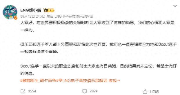 9月12日,EDG俱乐部周年庆的前一天,LNG中单选手被曝,因为与EDG战队存在合同纠纷或将缺席S14全球总决赛,引起舆论的轩然大波。