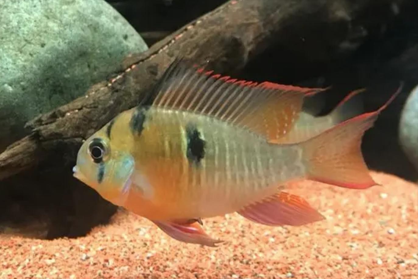 玻利维亚凤凰,又称袖珍蝴蝶鲷,主要产自玻利维亚的多斯桑托斯到特立尼达和多巴哥北部地区。维多利亚凤凰鱼是体型最大的短鲷品种之一,成年后的体长大约为7cm。玻利维亚凤凰体最引人注目的是它们美丽的红色尾巴,色鲜黄,鳞边有一些不规则的黑点,鱼鳍的边缘带有红色,在鱼鳍和身体上有蓝色条纹,无论是公鱼或母鱼体色都十分丰富艳丽,靓丽的红色尾巴很引人注目,尾部呈现琴弦状。它们的公母鱼不易区分,只有在发情或者打架时,母鱼的腹部会呈现粉红色。