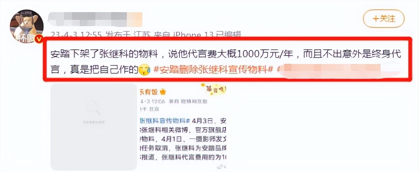 与张继科十分巧合的同为安踏代言人,自然会被有心人拿出来点名批评,嘲讽品牌不会挑选代言人,一个是“绝望的文盲”,一个是深陷赌博牵连前女友的“渣男”。