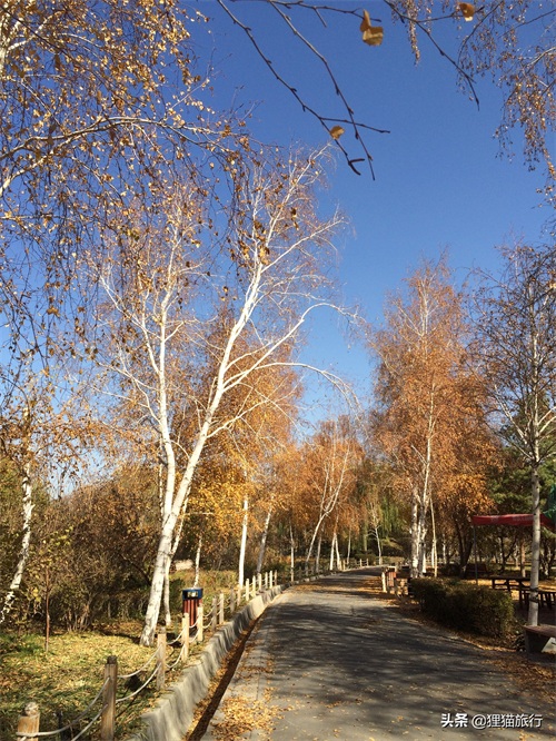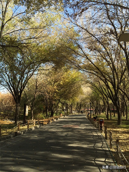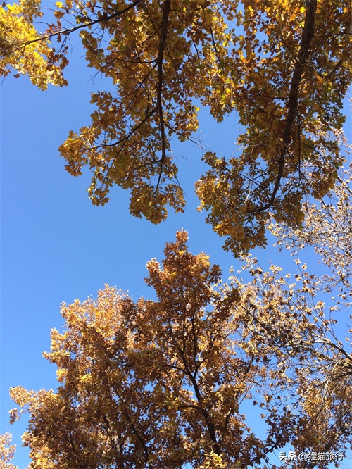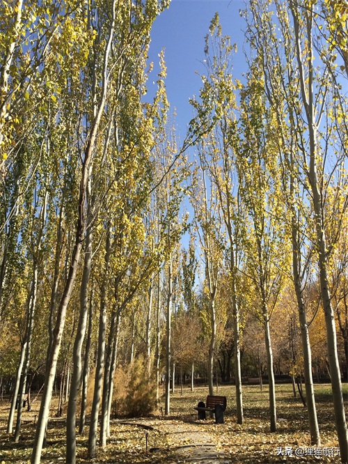 10月中下旬的新疆乌鲁木齐,金灿灿的树叶成了一道风景线,乌鲁木齐植物园里的树木本身就高大茂盛,湛蓝的天空成了黄色树叶最好看的背景。