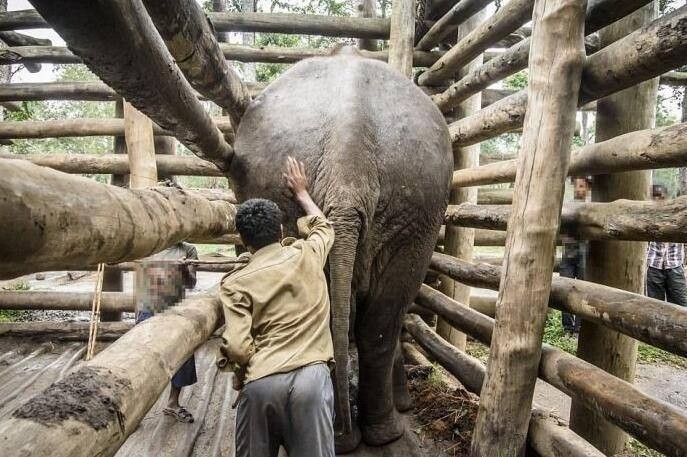 小象被带走后,会被关在一个狭小拥挤的小木笼里,身上绑满了铁链或者绳子。由于笼子的空间非常的狭窄,它们无法自由的移动或是卧倒,只能一直保持站立。为了让小象听话,驯象人要保持小象饥渴、挨饿。并持续用噪音干扰,不让小象休息,还时不时的用象钩抽打小象。