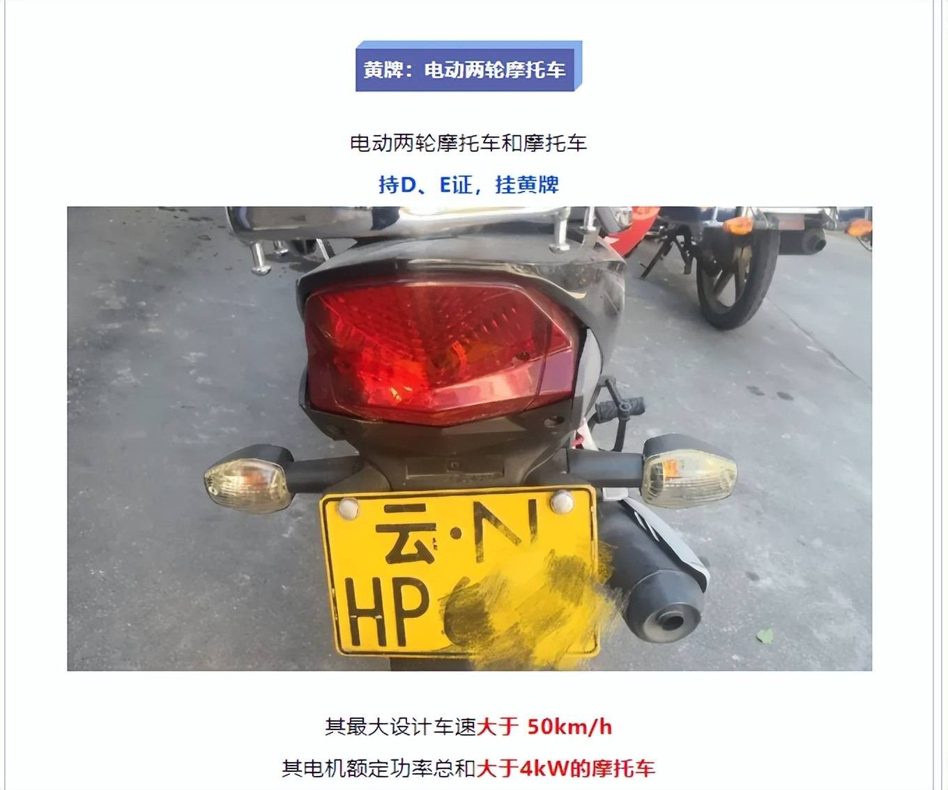 再来说黄牌电动车,它的官方名称为“电动两轮摩托车”,最大设计时速大于 50km/h,电机额定功率总和大于4kW的车型,它同样也是需要驾照的车型,需要持D和E驾驶证。