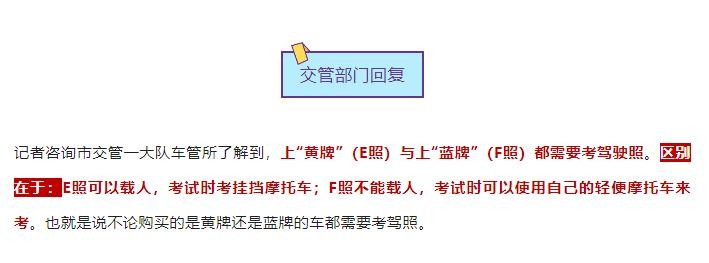 最后再来说说,都是需要驾照的蓝牌、黄牌电动车,它们两者有什么区别,对此,有交管部门对此回复:两者的区别在于,E照的黄牌电动车可以载人,考试时考挂挡摩托车;F照的蓝牌电动车不能载人,考试时可以使用自己的轻便摩托车来考。