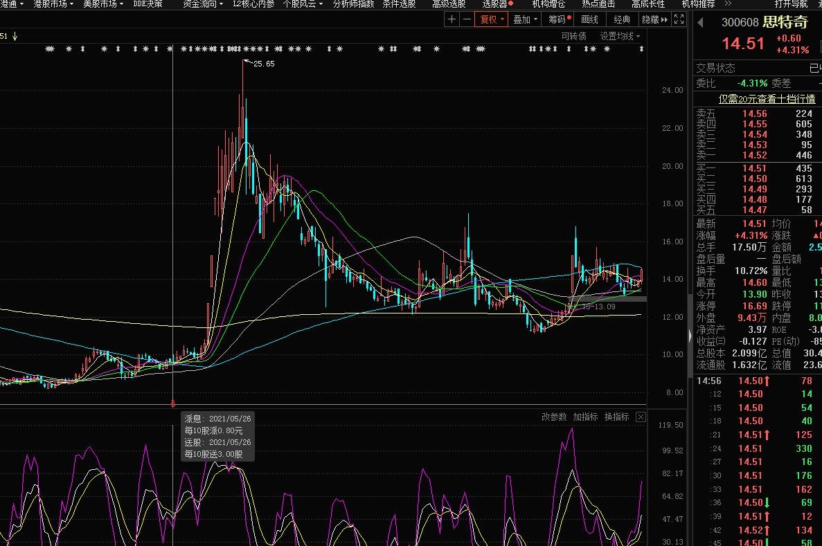 又如:300608思特奇在2021年5月26日实施了每10股转增3股并派现金0.8元的分配方案,在高送转预期的刺激下,其股价一路猛涨该股在5月26日到6月24日涨幅高达140%。