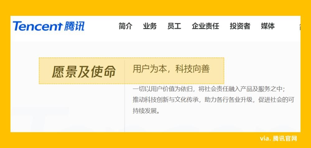 腾讯,创立于1998年,2003年第一次发布公司愿景“创一流的互联网企业”。2005年,腾讯发布2.0版本“最受尊敬的互联网企业”。到2019年3.0版本提出“用户为本,科技向善”。