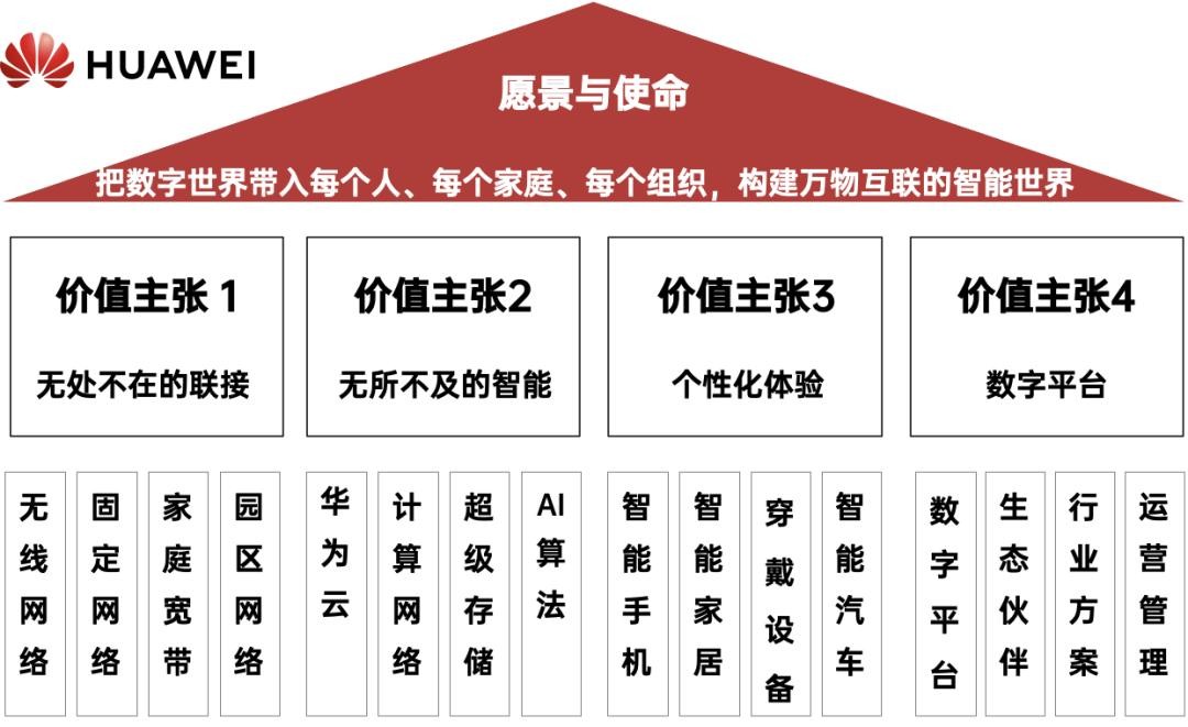 比如,华为的愿景和使命:“把数字世界带入每个人、每个家庭、每个组织,构建构建万物互联的智能世界。”