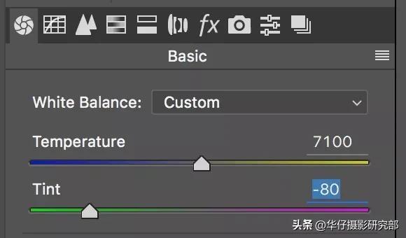 Photoshop 中的白平衡调节面板:色温(Temperature)、色调(Tint)