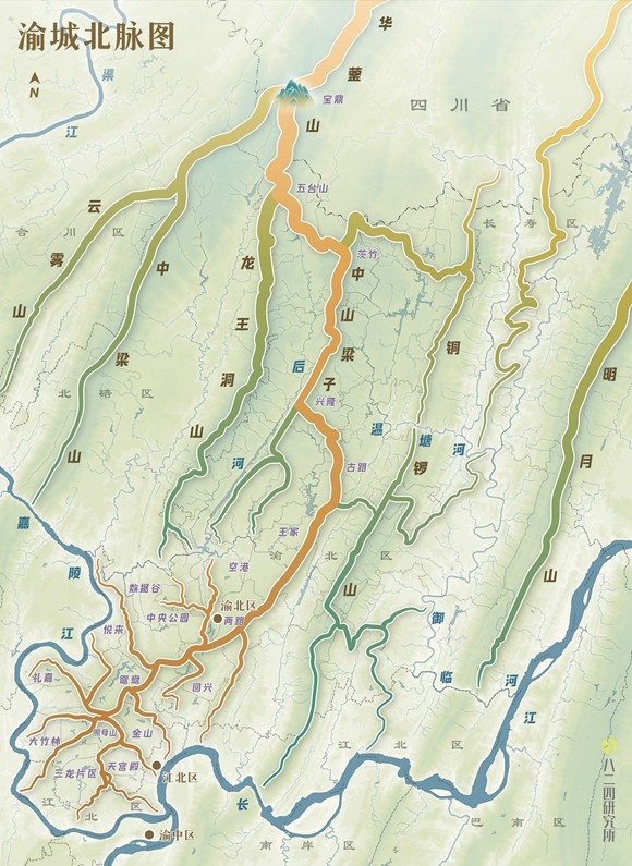 而北脉秦巴以华蓥山导昆仑之气至重庆城区。即以渝北境内之中山梁子,为重庆北城正脉、主脉。