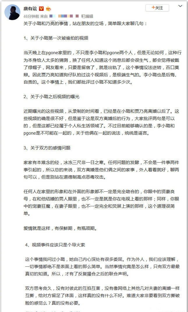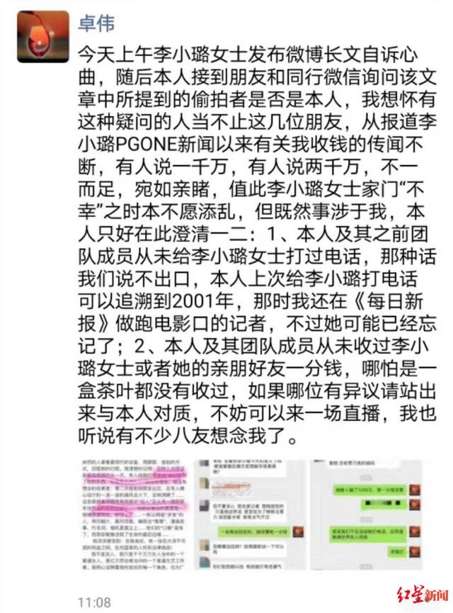 今天上午李小璐女士发布微博长文自诉心曲,随后本人接到朋友和同行微信询问该文章中所提到的偷拍者是否是本人,我想怀有这种疑问的人当不止这几位朋友,从报道李小璐PGONE新闻以来有关我收钱的传闻不断,有人说一千万,有人说两千万,不一而足,宛如亲睹,值此李小璐女士家门“不幸”之时本不愿添乱,但既然事涉于我,本人只好在此澄清一二:1、本人及其之前团队成员从未给李小璐女士打过电话,那种话我们说不出口,本人上次给李小璐打电话可以追溯到2001年,那时我还在《每日新报》做跑电影口的记者,不过她可能已经忘记了;2、本人及其团队成员从未收过李小璐女士或者她的亲朋好友一分钱,哪怕是一盒茶叶都没有收过,如果哪位有异议请站出来与本人对质,不妨可以来一场直播,我也听说有不少八友想念我了。