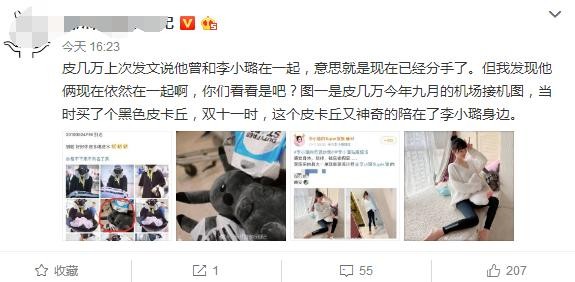 11月13号下午,有大号爆料:皮几万上次发文说他曾和李小璐在一起,意思就是现在已经分手了。但我发现他俩现在依然在一起,你们看看是吧?图一是皮几万今年九月的机场接机图,当时买了个黑色皮卡丘,双十一时,这个皮卡丘又神奇地陪在了李小璐身边。