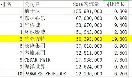 上图为2019年全球前十主题乐园的流量排名,虽然迪士尼的增速同比为负值,但依旧以超1.5亿人次的流量远远抛离排名第二的默林娱乐。