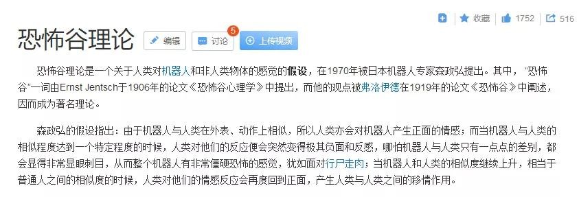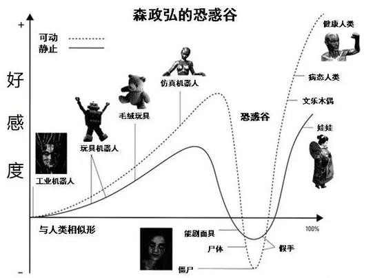 “恐怖谷效应”最早经由Ernst Jentsch于1906年的论文《恐怖谷心理学》中提出,它描述了仿生机器人的容貌在逐步朝着人类形象进化的过程中,人类的主观感受的变化历程:先缓步上升,然而到来某个临界点却会呈现断崖式下坠,之后再慢慢攀爬上升---