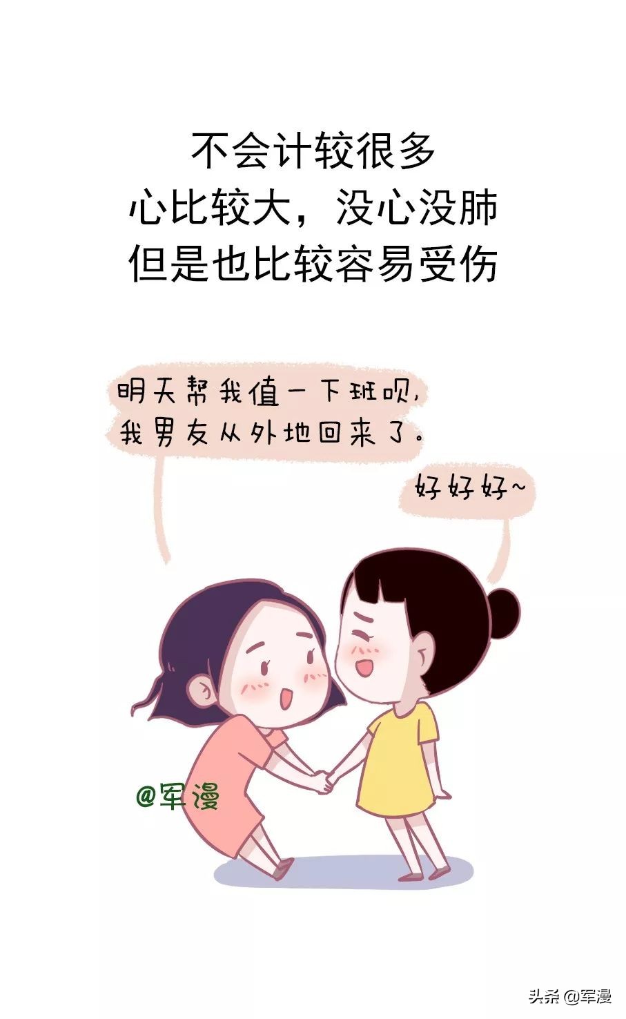 不会计较很多,心比较大,没心没肺,但是也比较容易受伤