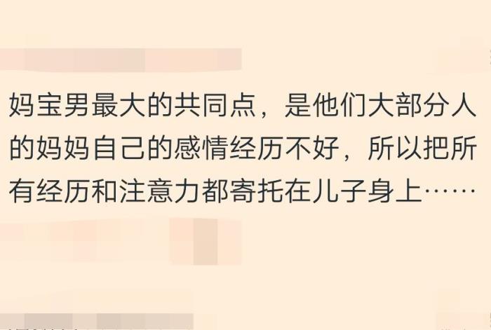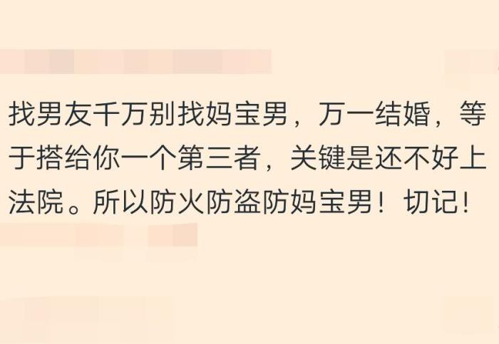 网友:我前男友也是妈宝,刚开始谈恋爱,什么都好,后来见到他妈妈之后,只要我们出去约会,五分钟打一个电话,我都快被烦死了,洗完澡直接光着在房间走来走去,他们都不感觉尴尬,当时我就跟男朋友说了一句话,如果以后我分手,肯定是因为你妈。
