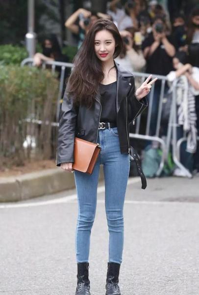 南韩腿精李宣美真的是让人羡慕嫉妒恨啊,一双笔直修长的腿,穿上马丁靴,好像腿又长了,搭配小皮衣,帅气又俏皮。