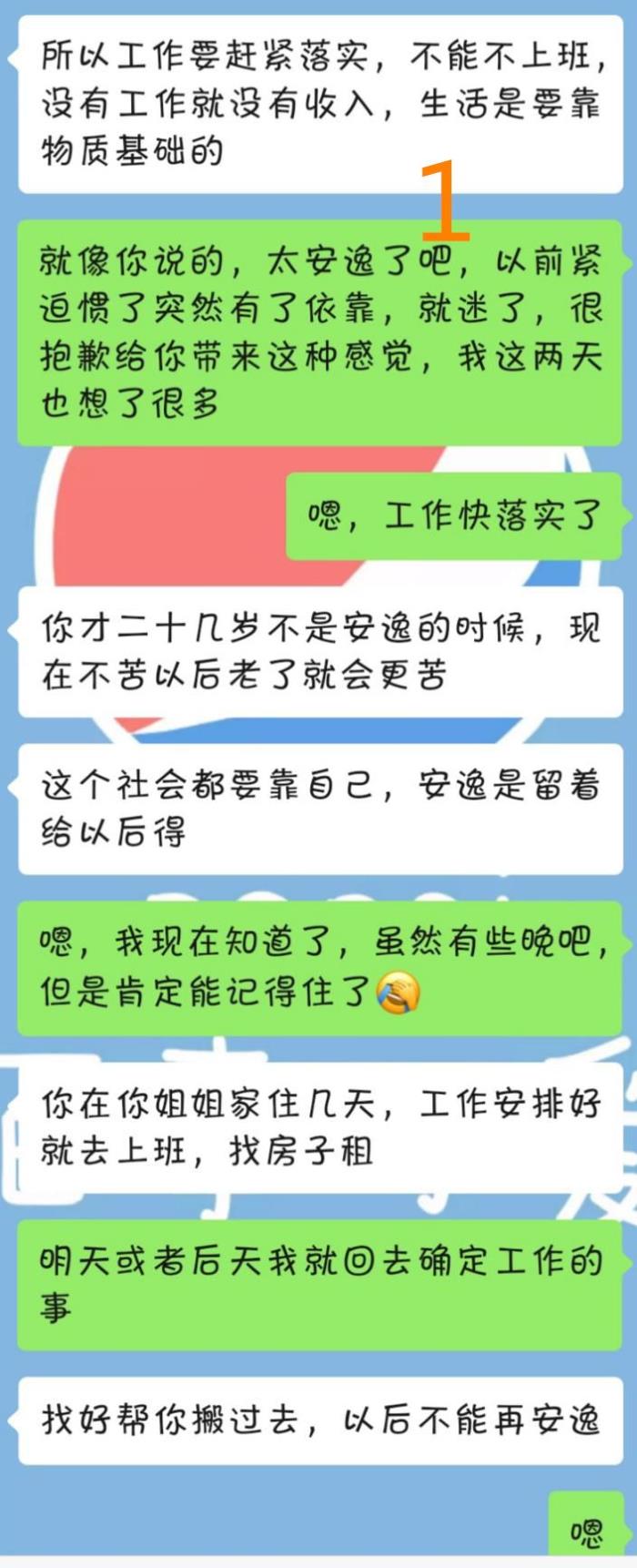 不想拖着我也不想拖着自己,也觉得我无法和他1+1≥2,因为我去年有大半年时间未工作,今年也一直没有稳定,前一个星期我又失业了,导致他最终选择和我开口谈分手。