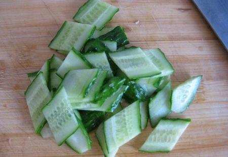 4黄瓜切菱形片儿。鸡蛋磕入碗中打散。