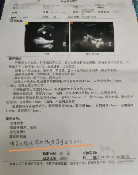 一位前列腺增生患者,排尿困难,排尿后膀胱内仍然残余尿液约516毫升,彩超提示双肾积水,肾功能肌酐达668umol/L!已经处于尿毒症期!紧急放置尿管,20天后,肌酐已经下降400,达到275umol/L左右!