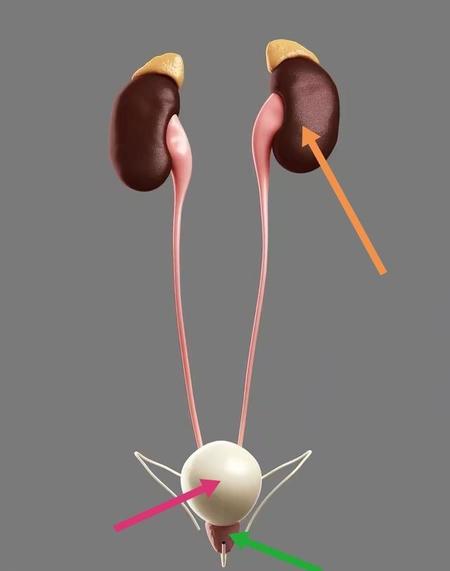 长期憋尿后,箭头所指的肾脏、膀胱、前列腺均可出现问题