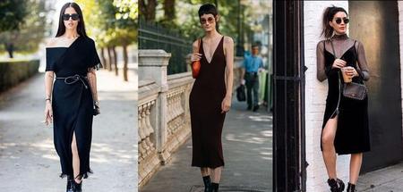 黑色短靴搭配同色系连衣裙是极受欧美穿搭博主喜爱的搭配,短靴得酷感与裙子的柔美结合,又是风情万种又是酷帅飒爽。