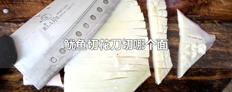 鱿鱼切花刀切内里面。鱿鱼内里面是比较光滑、有骨的那面。如果切外面那一层,则炒出来的鱿鱼不会成卷。另外在切鱿鱼花刀的时候,注意每隔半公分左右切一刀,并且斜刀切,切至2/3深,不切透,依次从一边切到另一边。