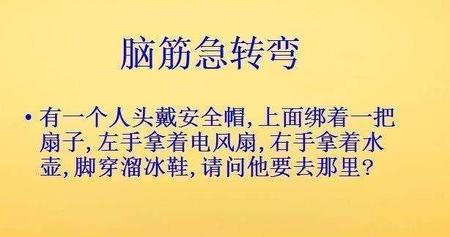 那么问题来了,什么是高难度的逗笑呢?当然是脑筋急转弯了,少年。大家是不是发现,很多脑筋急转弯都自带笑点,你猜不对就哈哈一笑,猜对了就会心一笑,不管咋样都是笑,所以用来对付笑点高的人是再合适不过的了。找几个高难度的脑筋急转弯,让他想上一整天,保准自己都傻笑了。