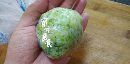 7、双手拿起菜板上的保鲜膜,将包在保鲜膜中的米粉揉搓成饭团即可,揉搓成圆形饭团后,尽量压实一点,这样待会取出饭团才不会散;