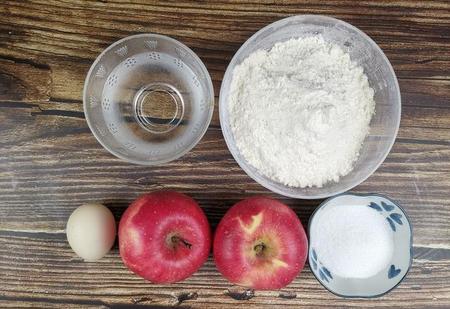 食材:苹果2个,白糖50g,面粉200g,鸡蛋1个,水适量