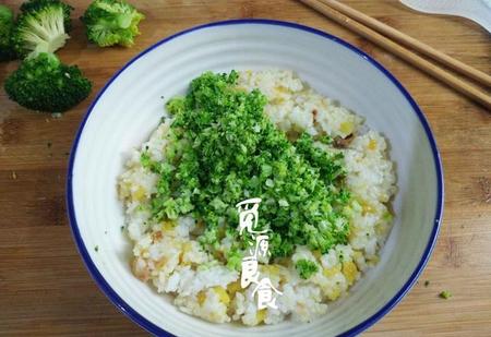 3、米饭中加入少量的食盐和胡椒粉,连同刚刚放入的西蓝花碎,搅拌均匀即可;