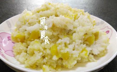 电饭煲煮米饭大家应该都是会的,一般时间都不会太长,30分钟左右吧,所以这个煮米饭的时间,我就直奔卫生间,开始自己的洗漱和整理内务,待我再次来到厨房的时候,米饭就蒸好了,直接打开电饭煲的锅盖,然后用勺子将锅中的红薯块捣碎,同米饭充分融合,大致是这样的,见下图;