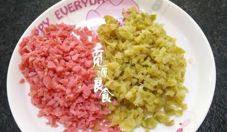 4、这时我们将刚刚准备好的火腿肠和榨菜,也放在菜板上切得细碎一些,见下图;