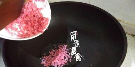 将保鲜膜平铺在菜板上,用饭勺舀一勺红薯米饭放在菜板上,然后用饭勺压平,然后在小汤匙舀一勺刚刚炒好的火腿肠和榨菜碎放在米饭上面,见下图;