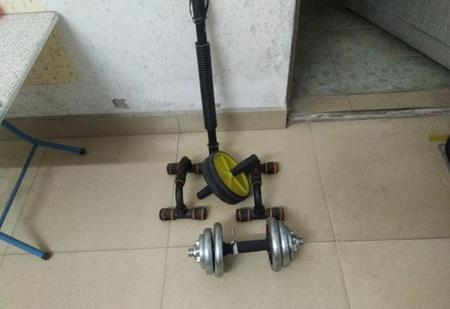 因为我不想花高价钱去健身房,也觉得没有必要去健身房,现在互联网时代,有不懂的上今日头条搜索问问就知道了。所以自己自备一些零碎的健身器材,除了照片里面的还有一根吸在墙的单干,还有一对绑在脚上跑步的小沙袋被同事借走了,全都是地摊货,超低成本,就这样自己的租房就成健身房了。
