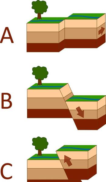 浅层地震是断层作用的结果,有三种断层:A.滑移;B.正向;C.逆向。但在地表约50公里以下,高温高压条件抑制了地震活动,因为地幔是粘性的所以不能发生脆性的断裂。但是,在俯冲带中,可观察深达670公里的地震。