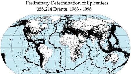 上图:全球1963年-1998年的地震事件全纪录。(看看日本和印尼、巴基斯坦和南欧等国基本上都被黑点埋了)