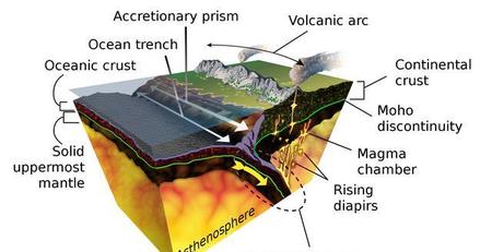 由于地球表面和地核外层之间的温差以及高压和高温下的岩石经历数百万年缓慢的蠕变、形变,地幔中实际上存在着物质的对流循环——热的物质上升,而较冷较重的物质下沉。物质的向下运动往往发生在被称为俯冲带的板块边界处。
