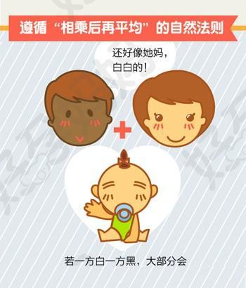 我们人类的肤色主要是由两对以上的基因来控制的,肤色的遗传是“爸爸妈妈的肤色相乘之后再平均”,也就是说宝宝的肤色是父母肤色的“平均中和”色。