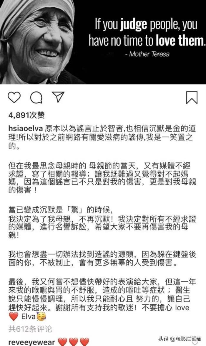 她在社交平台上发长文怒斥谣言传播者,并称会对散播谣言的媒体进行名誉诉讼。