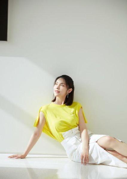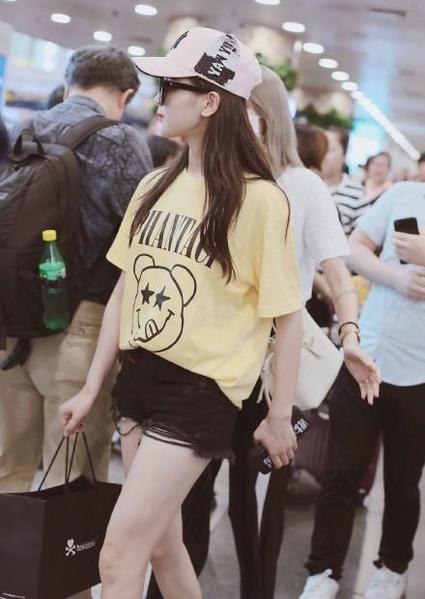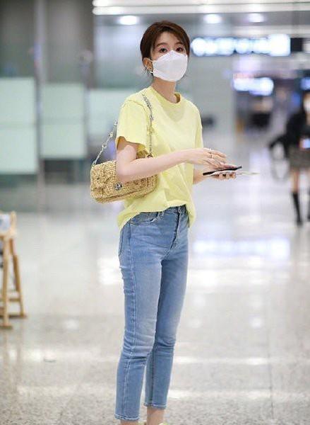 这是早前明星乔欣的穿搭,牛仔裤+黄色T恤,搭配精致单肩包,简单又时髦。