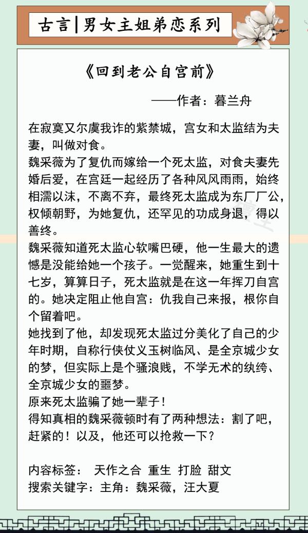简评:本文讲述前世在宫中相互持、相濡以沫的一对情人,今世再续前缘的故事。女主魏采薇,前世是宫女,男主汪大夏,前世是太监,两人在吃人的皇宫中一步步往上爬,最后手掌重权,却双双英年早逝。死后重生,女主回到少女时期,实施复仇计划。有了上辈子的经验加持,这辈子女主悄无声息地将害她家破人亡的仇人一个个送去阎王殿。与此同时,她要及时制止汪大督公汪大夏自宫的惨剧。然而没想到的是,这厮根本不像他自夸的那般,什么行侠仗义翩翩公子,明明是人憎狗嫌的纨绔混小子!