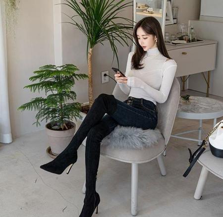 像上图的MM,她的牛仔裤其实是一条靴裤,穿上身后,就将裤子塞进靴子里,靴子也是选择紧贴腿部的那类,带细高跟,搭配上身的修身线衫。