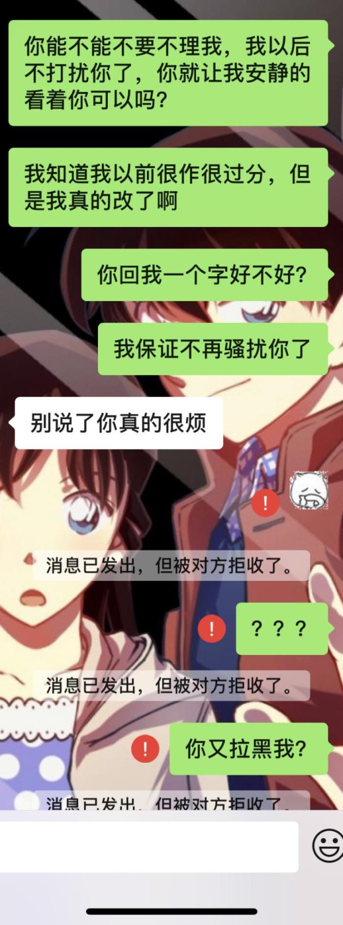 一旦你发的消息让对方有压力了,对方很难再跟你继续聊下去。他只会觉得你在强迫他,纠缠他。导致你发的消息要么被他绝情的"怼回来"——"别给我说这些!我们早已经分手了!"要么直接被他删除拉黑。
