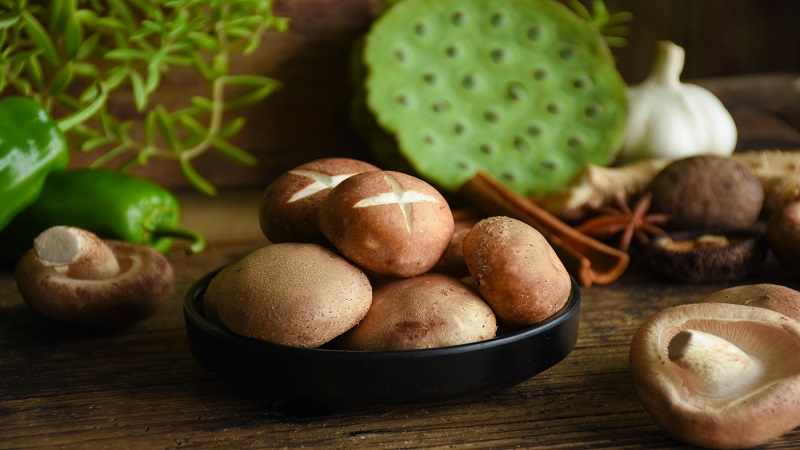 花菇是菌中之星,花菇的顶面呈现淡黑色,菇纹开暴花,白色,菇底呈淡黄色。花菇因顶面有花纹而得名。天气越冷,花菇的产量越高,质量也越好,肉厚、细嫩、鲜美,食之有爽口感。