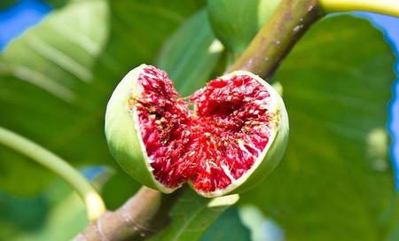 无花果,原产地为阿拉伯世界,在我国新疆无花果种植面积是最大的,那里有独特的气候和自然环境,特别是南疆地区出产的无花果,个大如小号的蒴果,而且肉厚含糖量还高,亦被当地人称为糖包子,入口味道极佳。无花果的微量元素和矿物质含量丰盛,其中的钙含量也高。