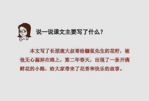 这篇课文只要讲述了鼹鼠先生收到长颈鹿大叔的花籽后,不小心漏在了松鼠太太的家的路上,第二年春天,那条小路开满了鲜花,给大家带来了惊喜和快乐的故事。