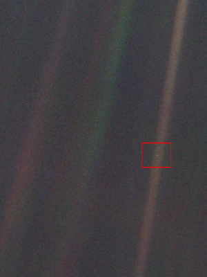 这个著名的多米图像,被称为地球“黯淡蓝点千米(Pale Blue Dot)”。这是一张地球的照片,摄于图片太空1990年2月14日,由旅行者1号太空探测器从60亿公里(37亿英里)的创纪录的距离拍摄。地球是一个蓝白色的斑点,大约在右边棕色带的一半处.望远镜。