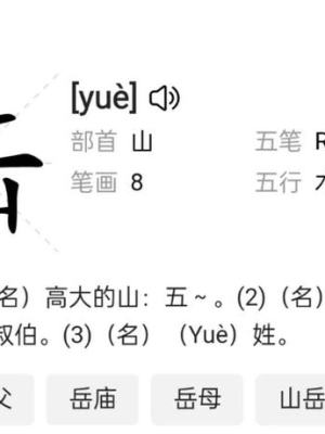 a、(名)高大的山,五岳。b、(名)称妻的父母或叔伯。c、(名)(Yuè)姓。