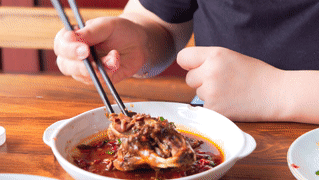 先张嘴好好吮吸兔头上的红油,瞬间激发味蕾;然后从兔嘴的位置将兔头对半掰开,先吃兔头的下半部分寓意,衢州鸭头,这部分兔肉占比最多,肉啃干净后再吃掉下巴骨内的兔舌。